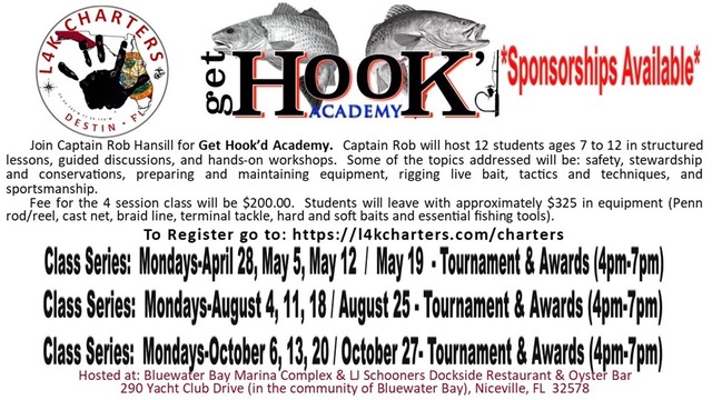 Families in our area found a standout opportunity recently when Get Hook’d Academy, a youth fishing program, led by L4K Charters and Capt. Rob Hansill and hosted by LJ Schooners Dockside Restaurant & Oyster Bar and Bluewater Bay Marina, welcomed young anglers. Under the leadership of Mate/Charter Captain Rob Hansill—a Marine Corps veteran—the academy welcomed students ages 7 to 12 for a four-week course of instruction and hands-on angling experience in October.