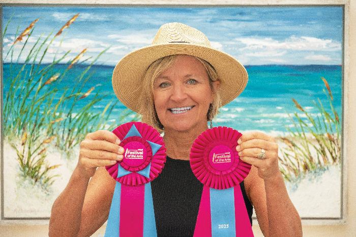 Niceville artist Kathy Schumacher was a two-time winner. She was selected as the 2025 featured poster artist with Symphony in Sails, a heavily textured impasto oil of three vibrant sailboats. Her “old world” knife palette technique clearly won over the weekend crowd, earning her the “People’s Choice” Award as well.